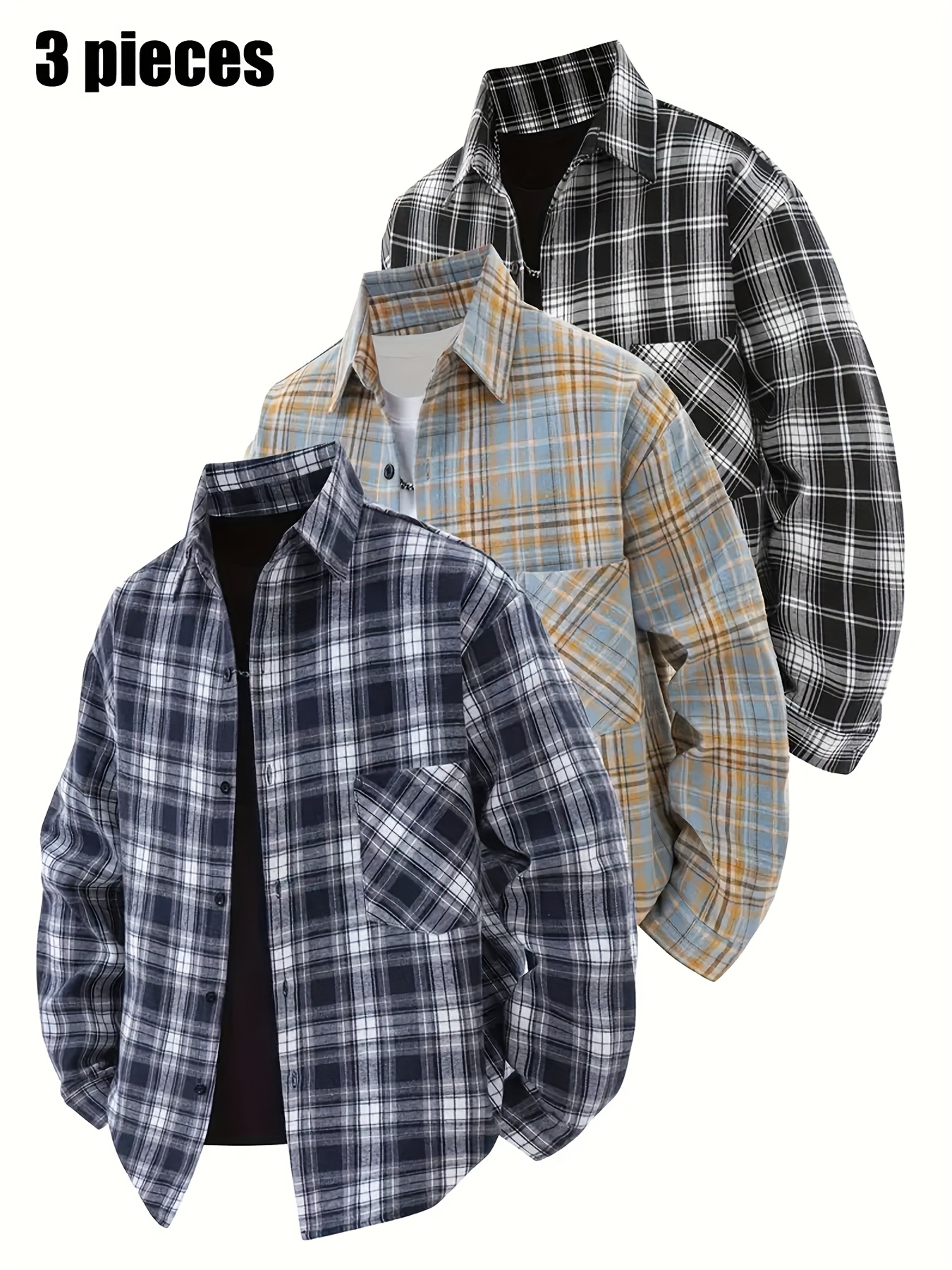 3pcs Men'S Scandinavian Vintage Plaid Shirt Set - Loose Fit, Breathable Rayon, Long Sleeve with Button-Up Design, Perfect for Fall & Spring Casual Wear, Casual Wear Shirts|Vintage Plaid Shirt|Asymmetrical Hemline, Thick