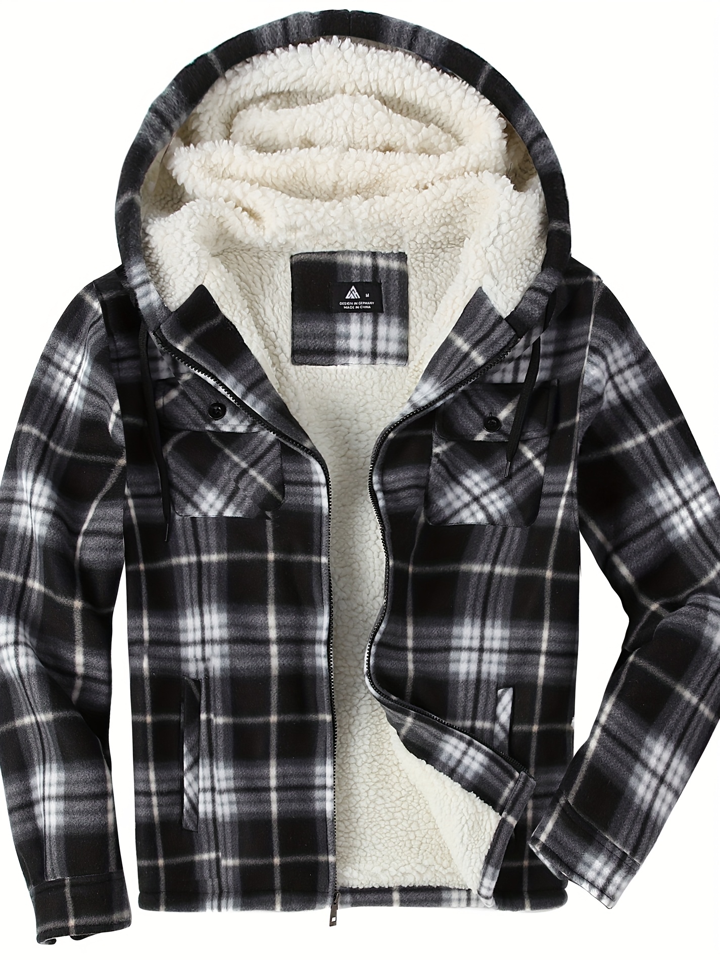 Men's Sherpa-Lined Full-Zip Hooded Jacket - Plaid Flannel Winter Coat with Turquoise/Black/White/Gray Plaid, Machine Washable, Full-Zip Front & Pockets - Casual Outdoor & Everyday Cold Weather Outerwear (Regular Fit)