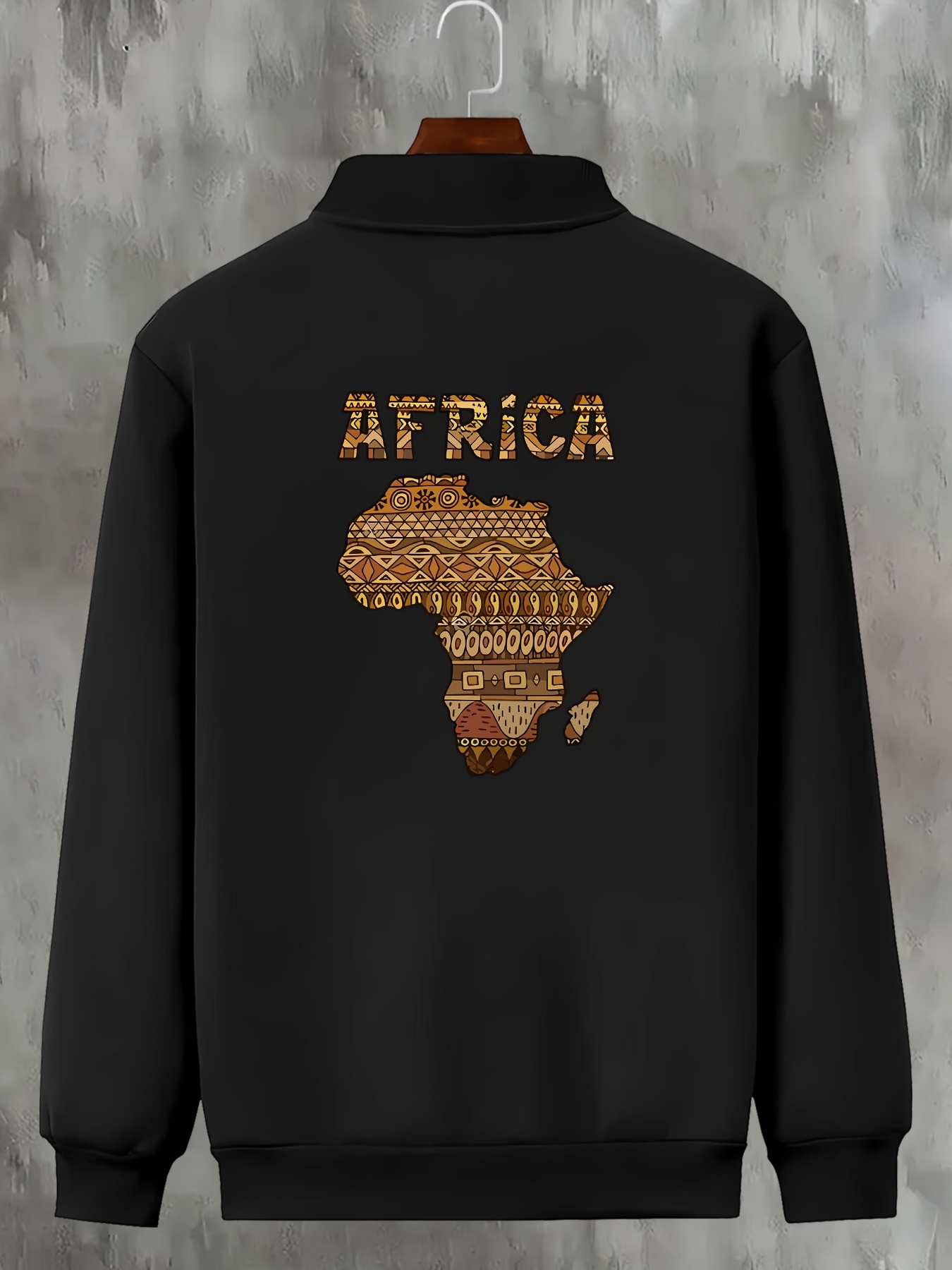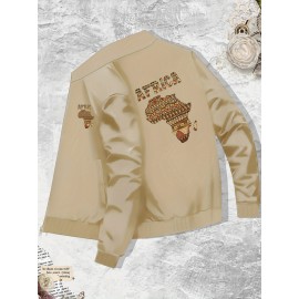 Men's Stylish African Print Zip-Up Jacket - Slim Fit, Beige with "AFRICA" Map Design & Tribal Patterns, Casual Outdoor Coat for Fall/Winter