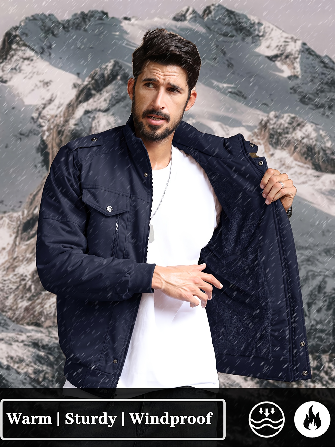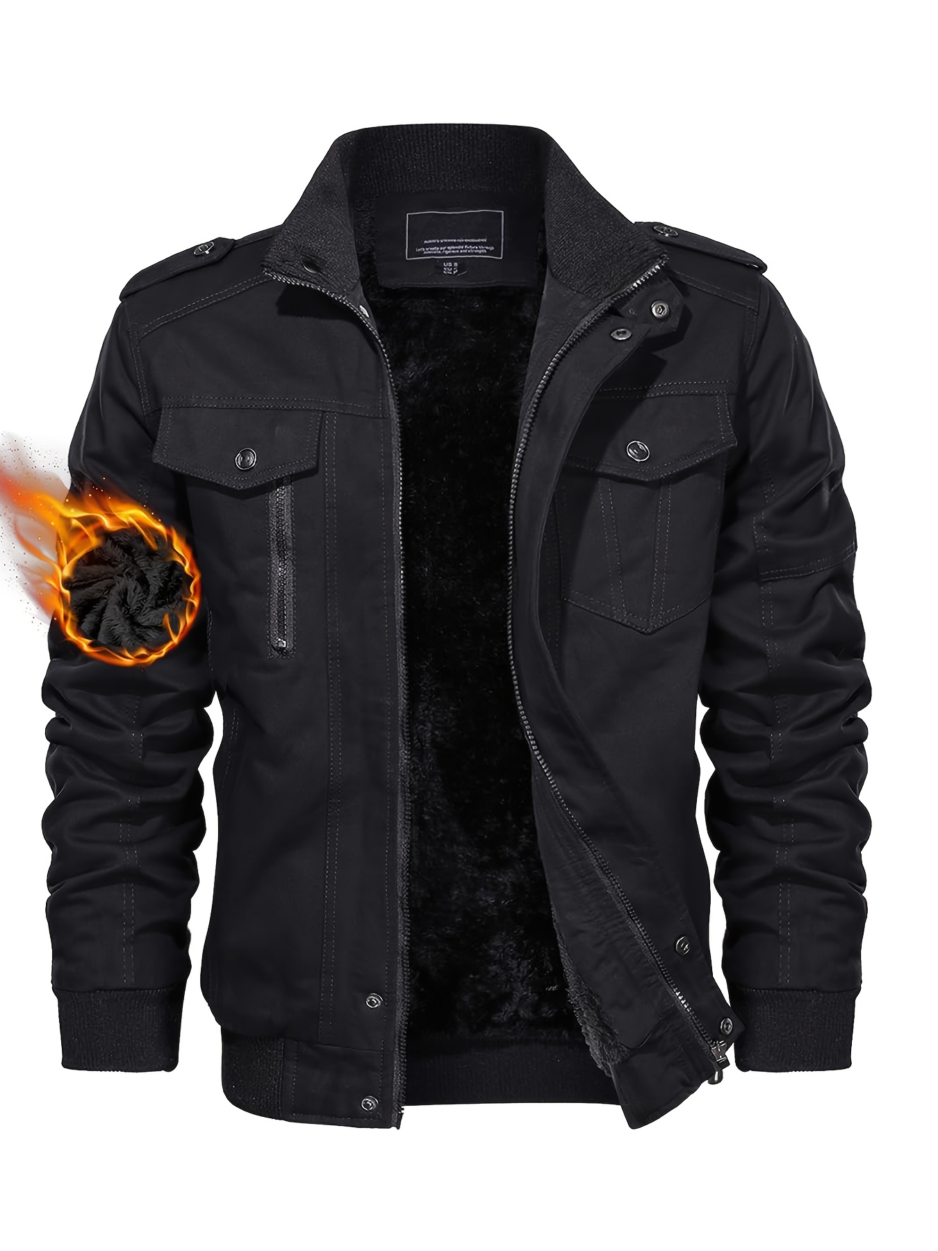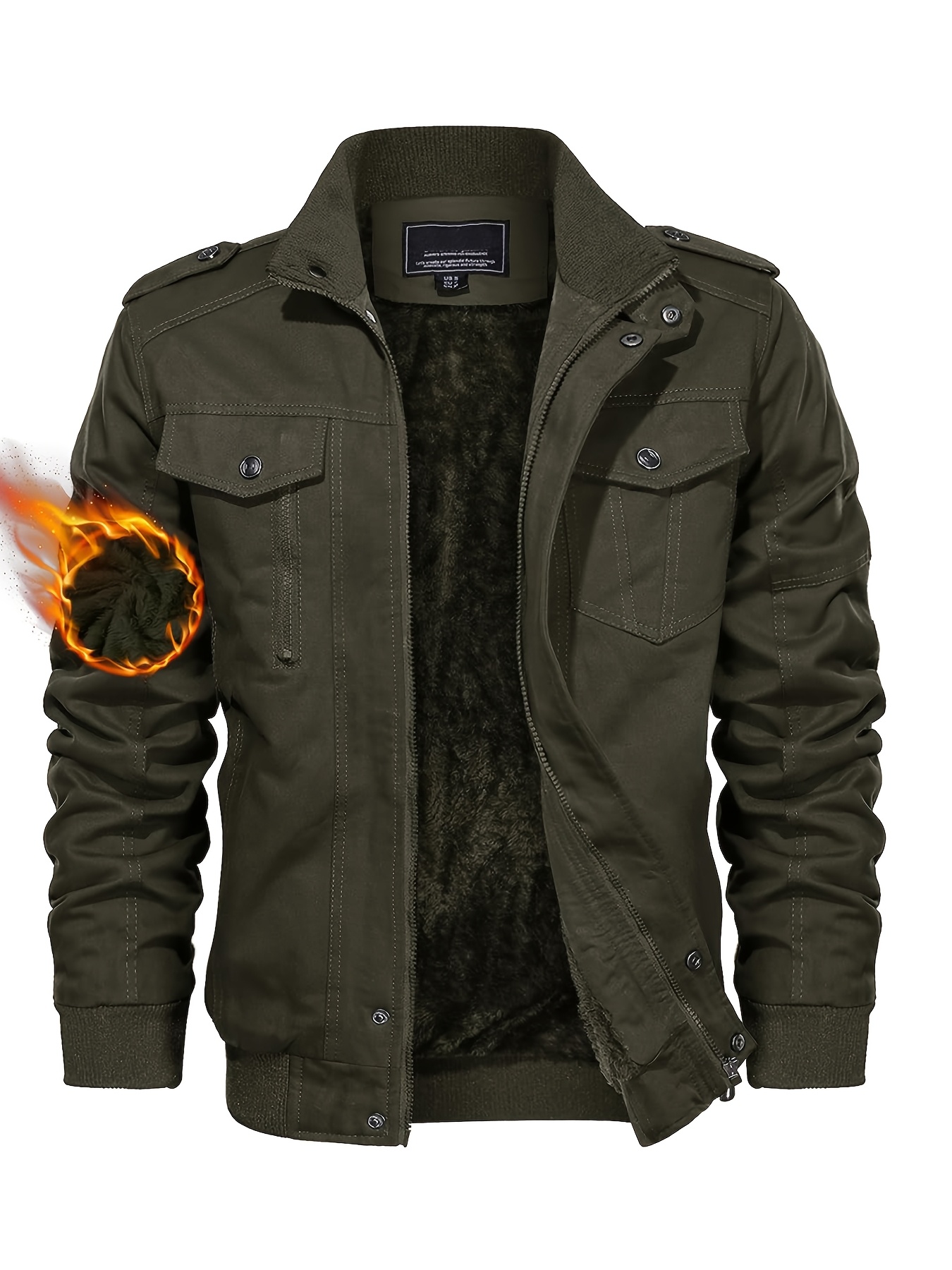 Men's Winter Fleece-Lined Cargo Jacket - Windproof Stand Collar Zipper Jacket with Ribbed Cuffs, Multi-Pockets & Soft Shell for Fall Winter Daily Wear, Outdoor Hiking Camping