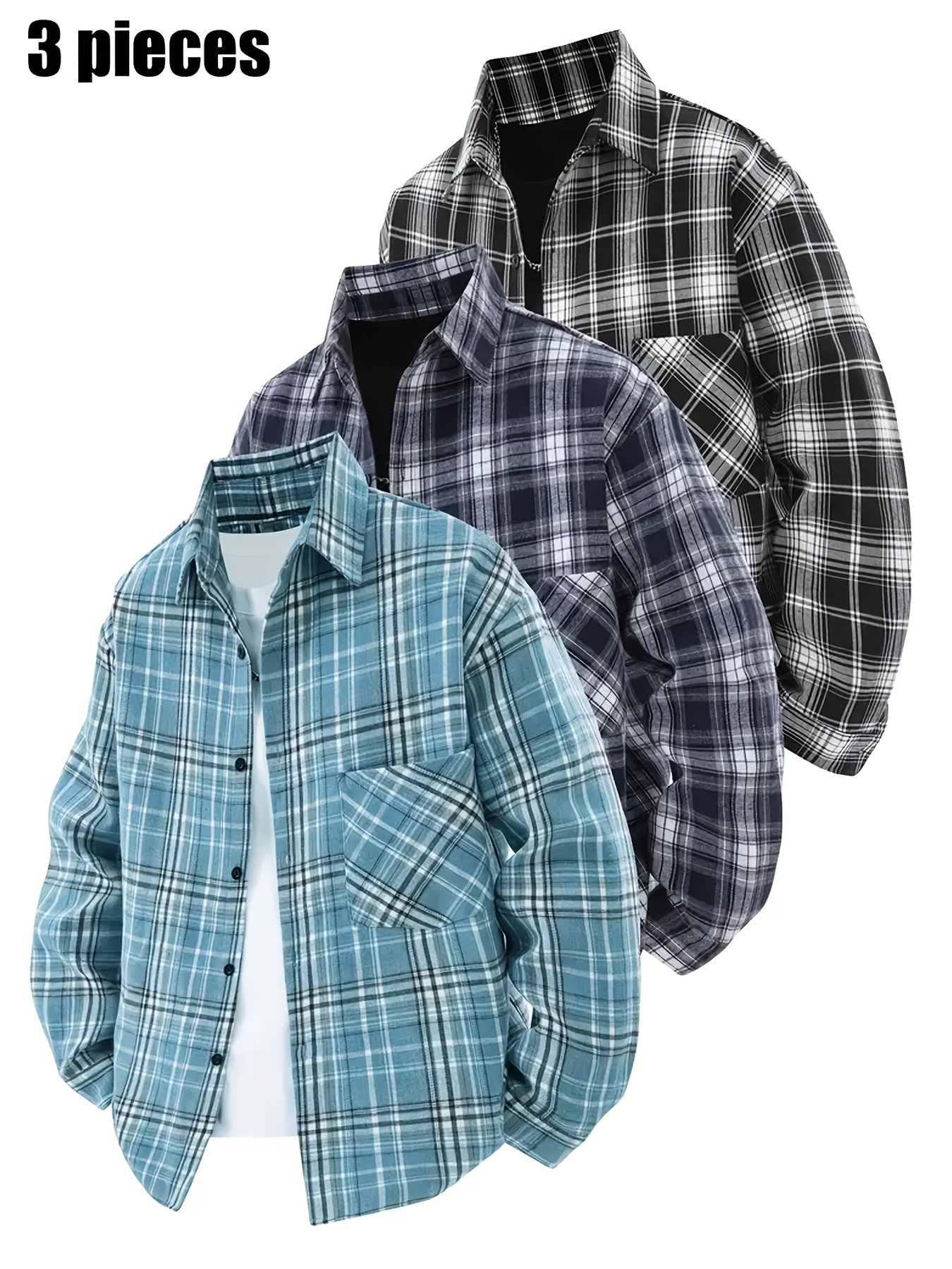 3pcs Men'S Scandinavian Vintage Plaid Shirt Set - Loose Fit, Breathable Rayon, Long Sleeve with Button-Up Design, Perfect for Fall & Spring Casual Wear, Casual Wear Shirts|Vintage Plaid Shirt|Asymmetrical Hemline, Thick