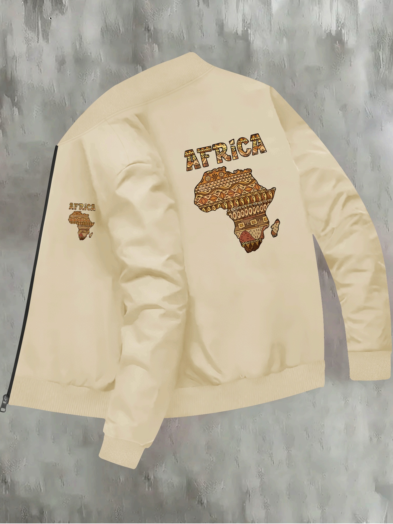 Men's Stylish African Print Zip-Up Jacket - Slim Fit, Beige with "AFRICA" Map Design & Tribal Patterns, Casual Outdoor Coat for Fall/Winter