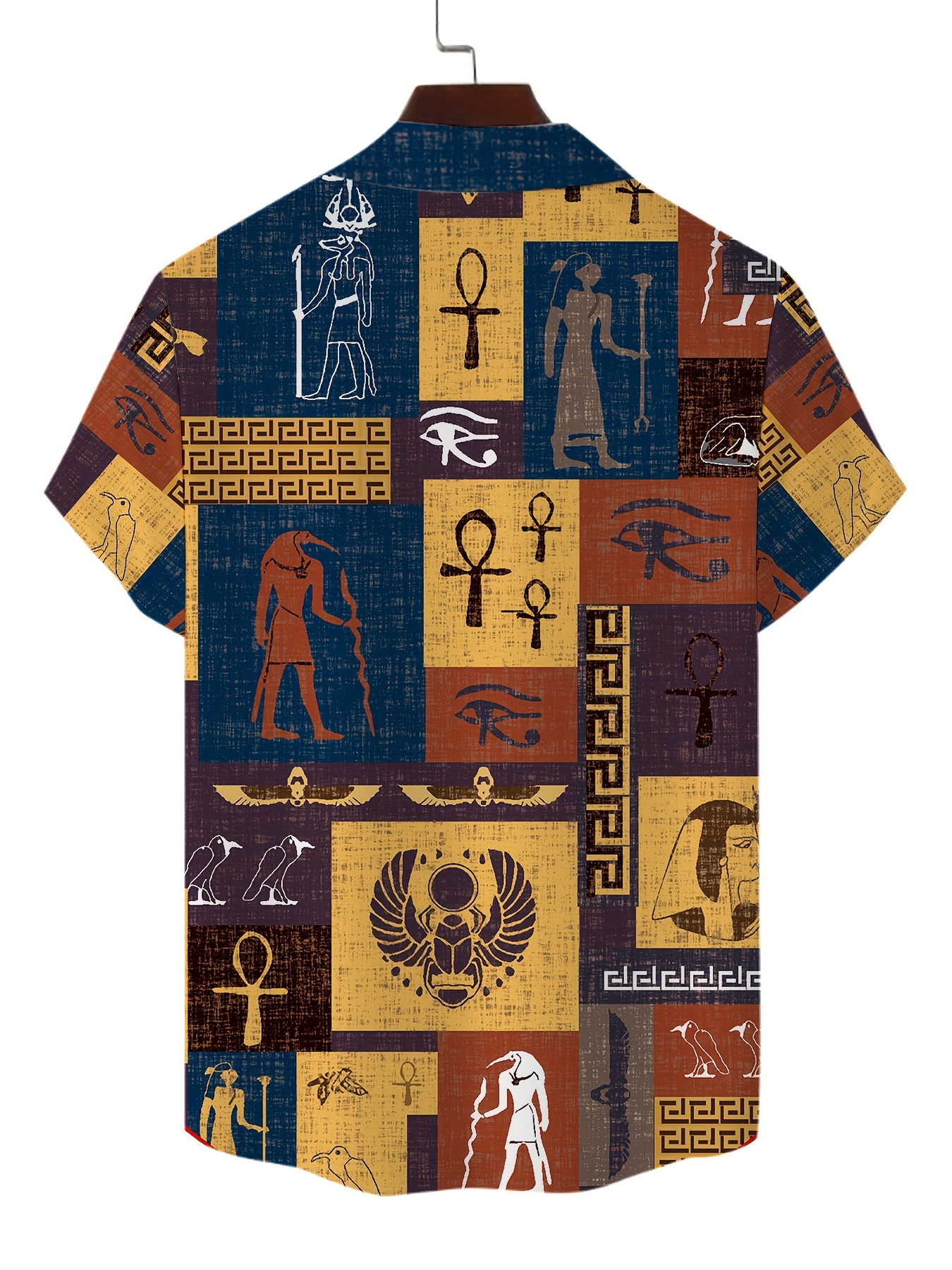 Men'S Vintage Egyptian-Inspired Geometric Art Print Short Sleeve Shirt - Casual Stand Collar, Button-Up, Non-Stretch Fabric, Regular Fit for Summer Outdoor & Casual Attire, All-Season Comfort, Summer Casual Wear | Artistic Print Shirt | Nonstretch F
